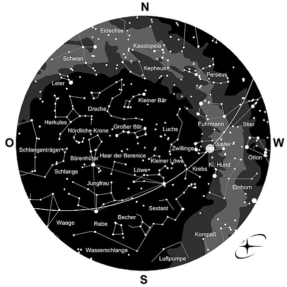 Während im Westen die Sternbilder „Zwillinge“ und „Kleiner Hund“ noch an den vergangenen Winter erinnern, haben bereits drei typische Frühlingssternbilder ihren Platz am Nachthimmel eingenommen: