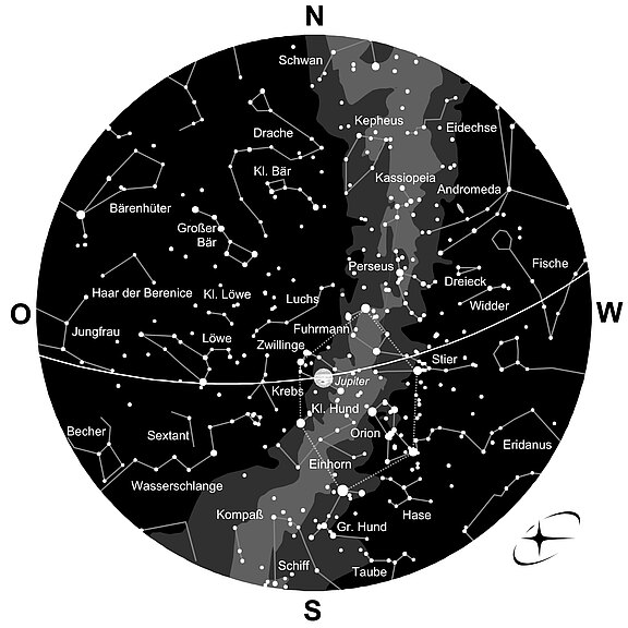 Jupiter, mit elf Erddurchmessern der größte Planet im Sonnensystem, streift durch die „Zwillinge“. Bereits in der Abenddämmerung ist er hoch am Osthimmel zu erkennen und dann fast die ganze Nacht über zu sehen. Der Gasriese ist kaum zu verfehlen: Nach Vollmond und Venus leuchtet er als das hellste Objekt am Nachthimmel. Er geht am Monatsersten um 6.53 Uhr unter, am Monatsletzten schon um 5.00 Uhr.