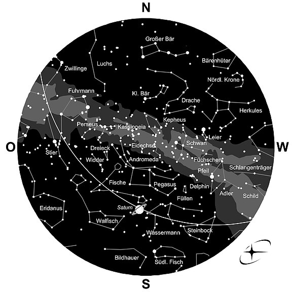 Mit einem scharfen Auge und ohne störende künstliche Lichtquellen ist im Sternbild „Andromeda“ das am weitesten entfernte, mit bloßem Auge sichtbare Objekt zu erkennen: die Andromedagalaxie (im Messier-Katalog der Astronomen als M31 verzeichnet). Sie ist die nächste größere Nachbargalaxie unserer Milchstraße, von der sie 2,5 Millionen Lichtjahre trennen. Sie besteht aus einer gigantischen Spirale aus 200 Milliarden Sternen, die in einer Diskusform angeordnet sind. In der Sternkarte ist sie als graues Oval markiert.