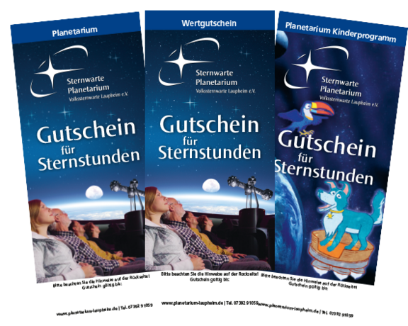 Gutscheine für einen Eintritt ins Laupheimer Planetarium, die Sternwarte oder Wertgutscheine zum Einlösen in unserem Astroshop sind ein ideales Geschenk für alle, die schon alles haben.