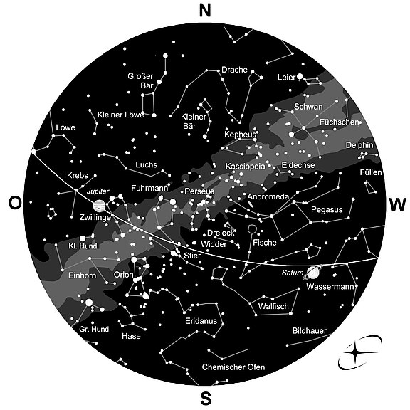Im Südwesten beenden die Herbststernbilder ihre Saison. Leicht zu erkennen sind das große Sternenviereck des „Pegasus“, die mit ihm verbundene Sternenkette der „Andromeda“ und der „Widder“, der aus einer Reihe von drei Sternen besteht. Südlich davon liegen die ausgedehnten, aber unauffälligen Sternbilder „Fische“ und „Walfisch“. Um diese mit dem bloßen Auge vollständig zusammenzusetzen, bedarf es klarer Winternächte. Hoch im Zenit stehen das Himmels-W „Kassiopeia“ und das kantige, auf dem Kopf stehende Ypsilon des „Perseus“.